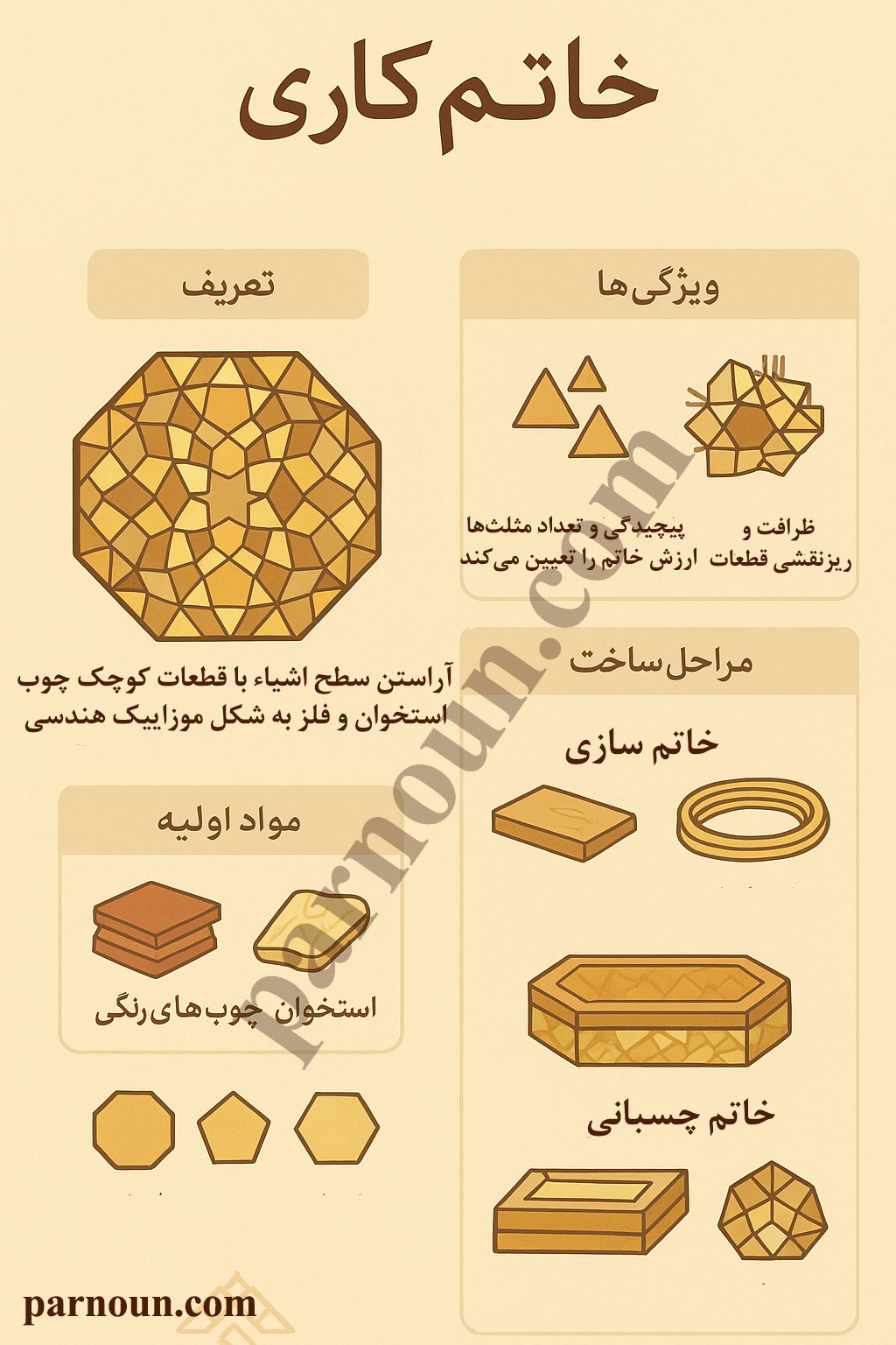 هنر خاتمکاری ریشه در تاریخ کهن ایران دارد و از دربار پادشاهان تا کارگاههای هنرمندان، مسیر طولانی و پرشکوهی را طی کرده است. این هنر، نمادی از ظرافت و دقت هنرمندان ایرانی در طول قرون است.