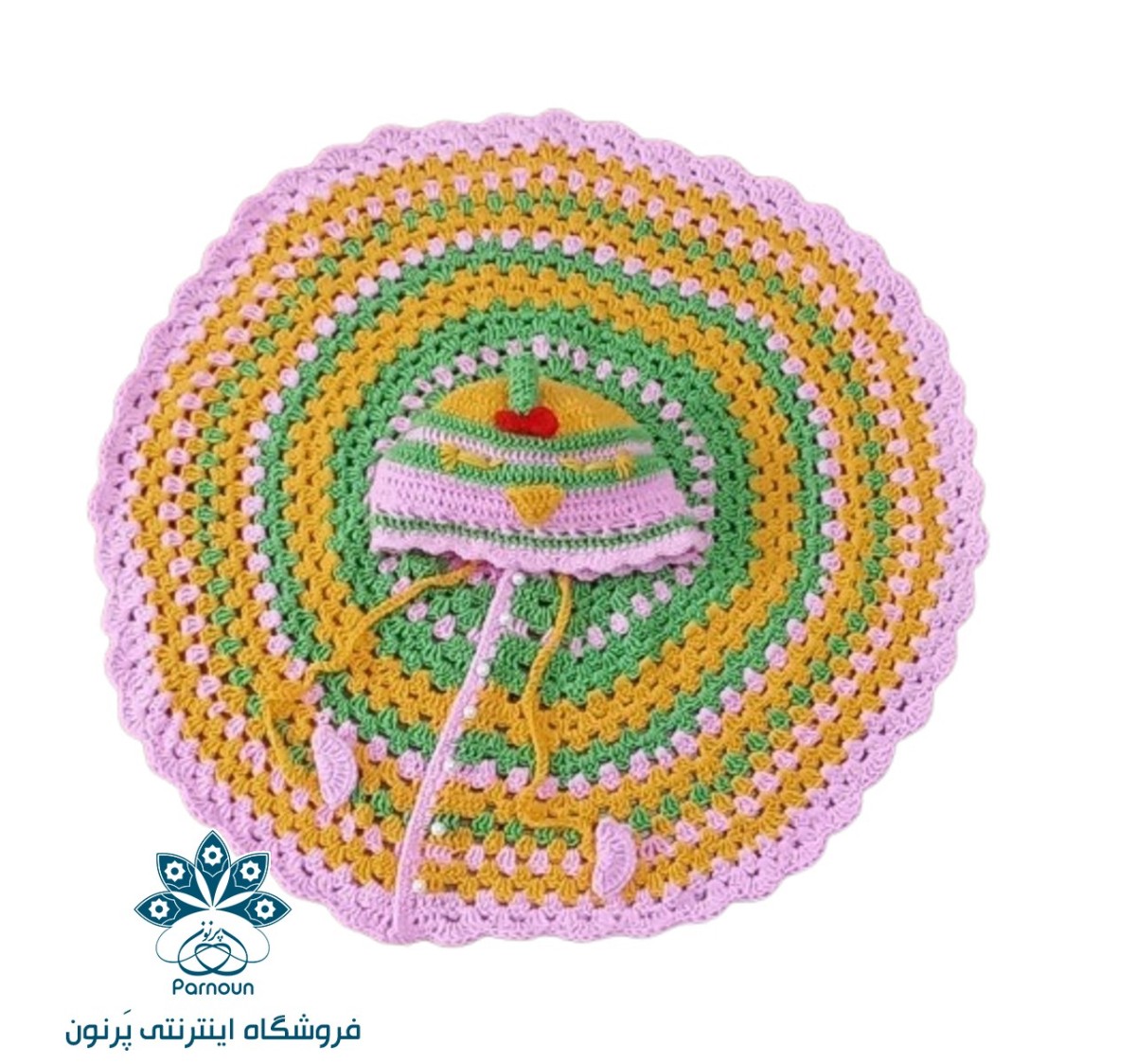 شنل قلاب بافی با رنگ زرد و صورتی و سبز