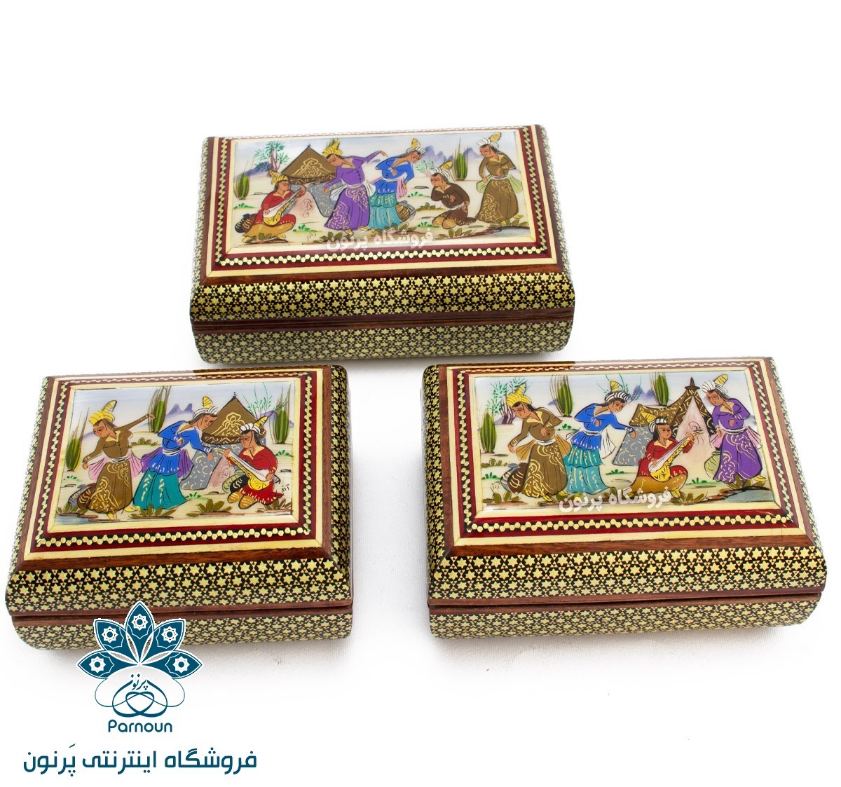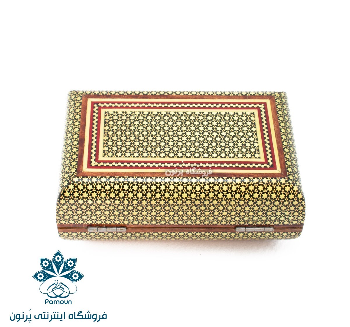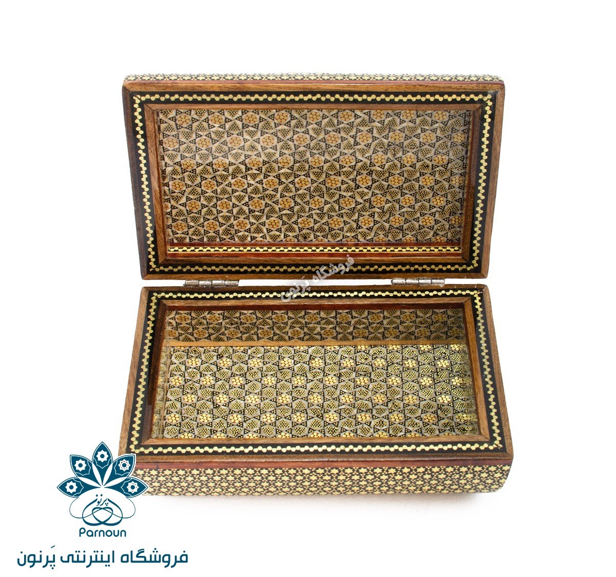 تمام بدنه این جعبه چوبی با هنر خاتم تزئین شده
