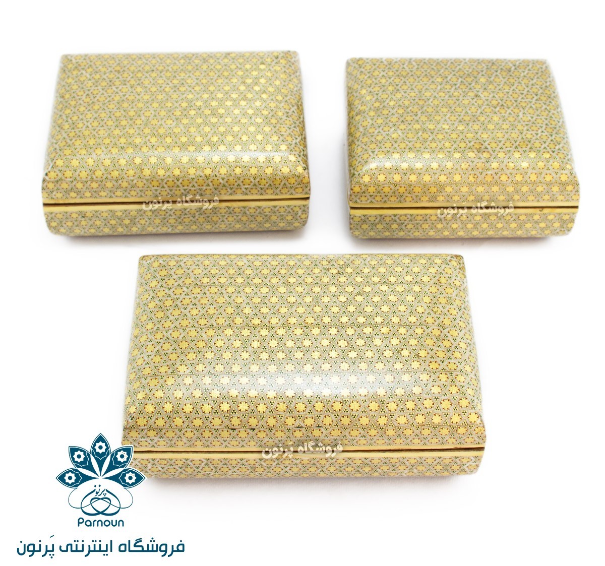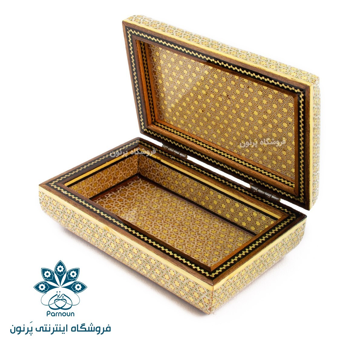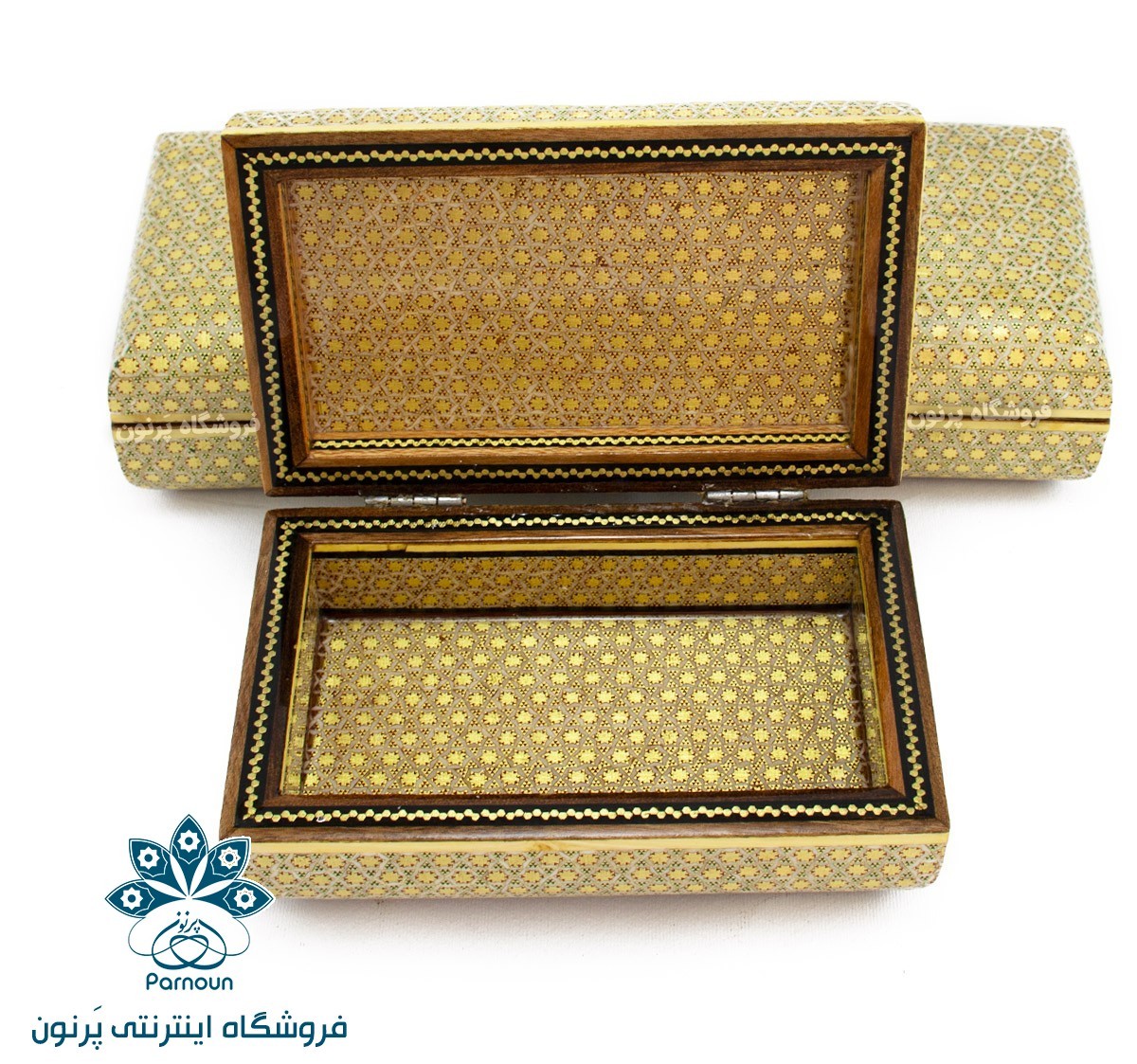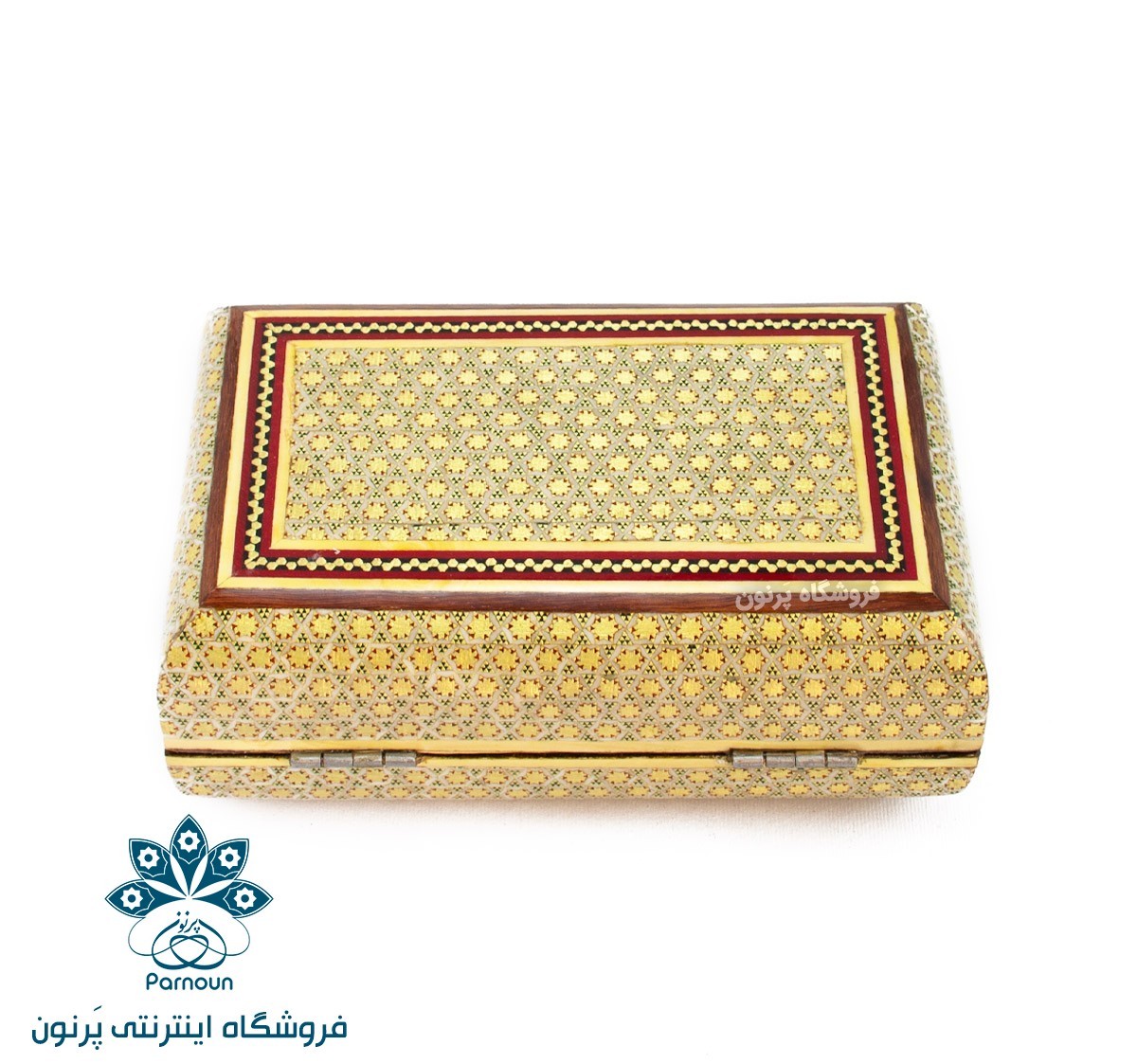 تمام بدنه این جعبه چوبی با هنر خاتم تزئین شده