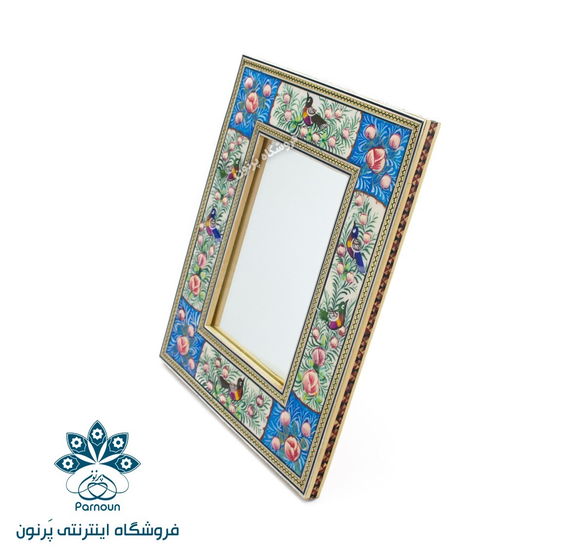 آینه تزیینی با قاب چوبی خاتم و نگارگری شده، این آینه زیبا در 2 طرح نقاشی متفاوت موجود هست که به هنگام سفارش میتوانید طرح آن را انتخاب کنید، در پشت قاب این آینه هم یک پایه نگه دارنده و هم یک گیره نصب شده و به همبن خاطر به غیر از قابلیت قرار گرفتن روی میز یا طاقچه قابل نصب بر روی دیوار نیز هست