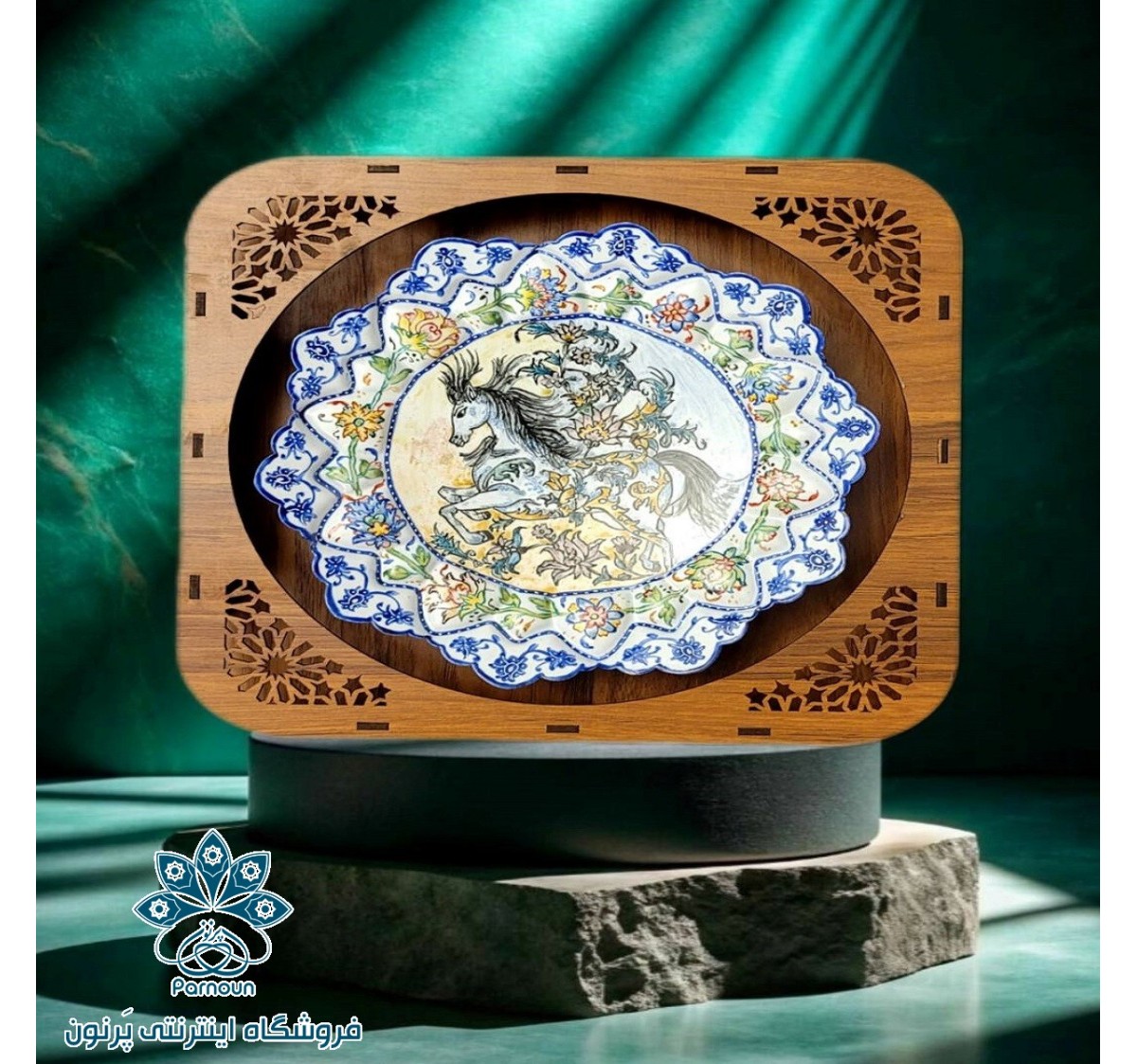 بشقاب میناکاری شده به همراه قاب چوبی مشبک