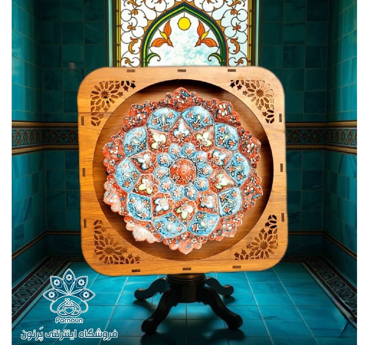 بشقاب میناکاری شده به همراه قاب چوبی مشبک