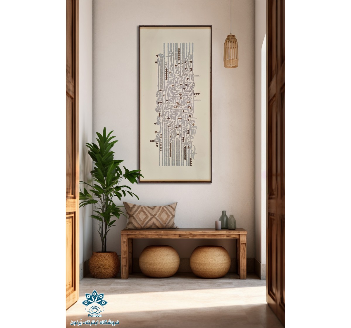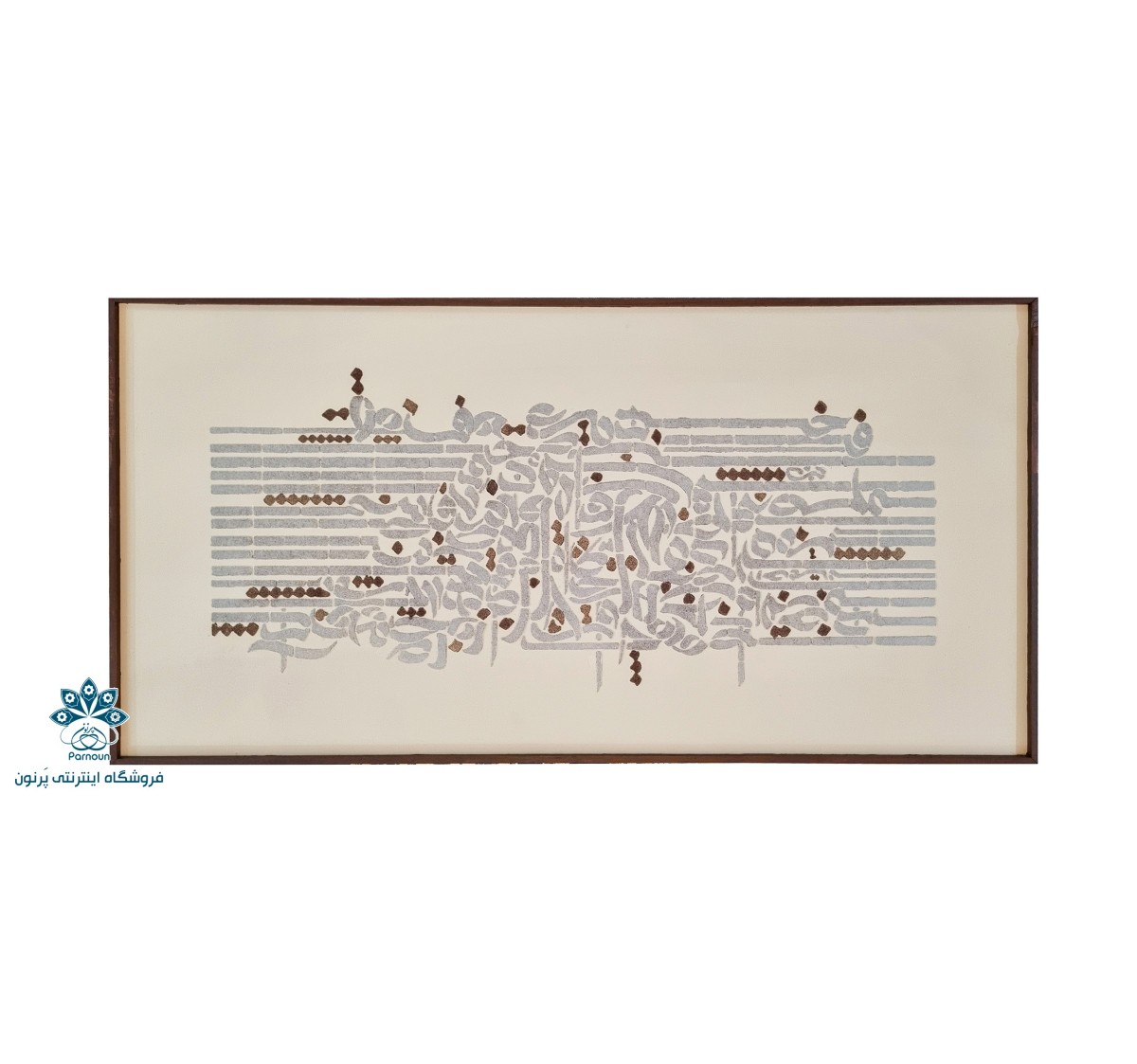در بخشهای نزدیک اثر، بافتهای مخملی دیده میشود که با پودر مخمل ساخته شده. ریزهکاریهای طرح خطوط کالیگرافی در هم تنیدهاند و نوعی گفتوگو میان نقش و نوشته ایجاد کردهاند. رنگهای گرم و نسکافهای، حس قدمت و اصالت را به بیننده منتقل میکنند.