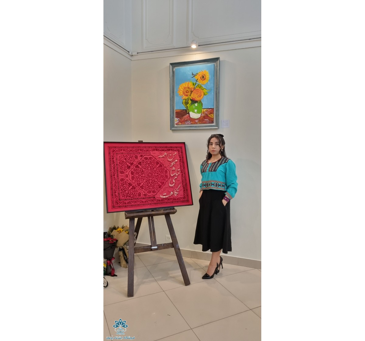 در بخشهای نزدیک اثر، بافتهای لایهلایهی پتینه دیده میشود که یادآور قدمت و تاریخ است. ریزهکاریهای طرح فرش با خطوط کالیگرافی در هم تنیدهاند و نوعی گفتوگو میان نقش و نوشته ایجاد کردهاند. رنگهای گرم و طلایی، حس قدمت و اصالت را به بیننده منتقل میکنند.