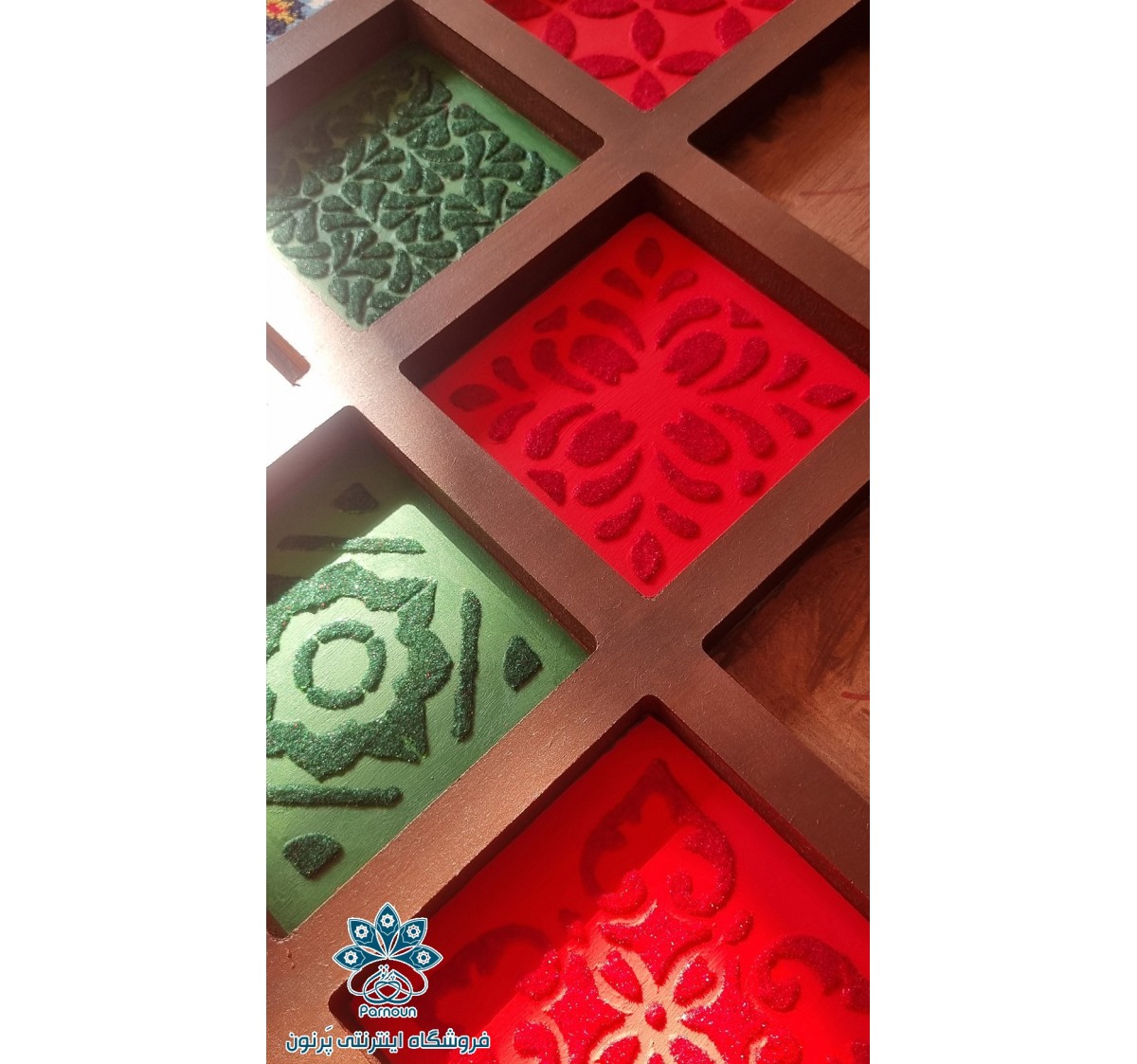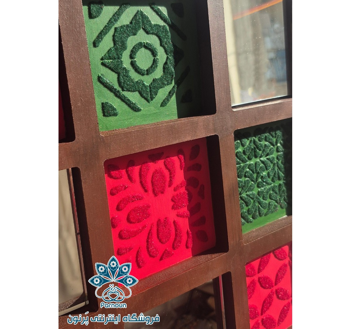 در بخشهای نزدیک اثر، بافتهای مخملی دیده میشود که با پودر مخمل ساخته شده. رنگهای گرم و شاداب قرمز و سبز در کنار یکدیگر، حس قدمت و اصالت را به بیننده منتقل میکنند.