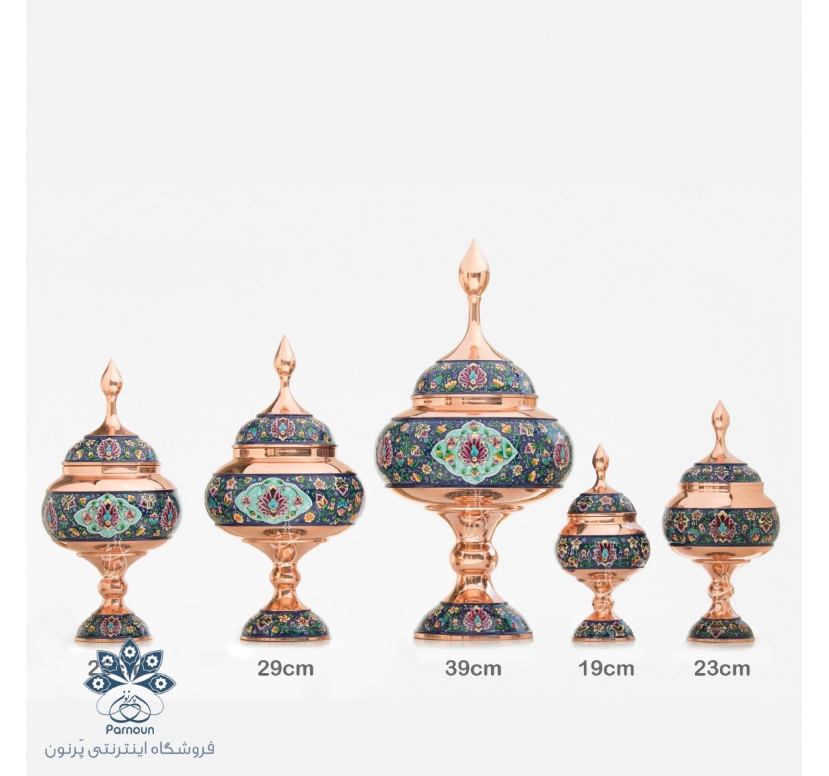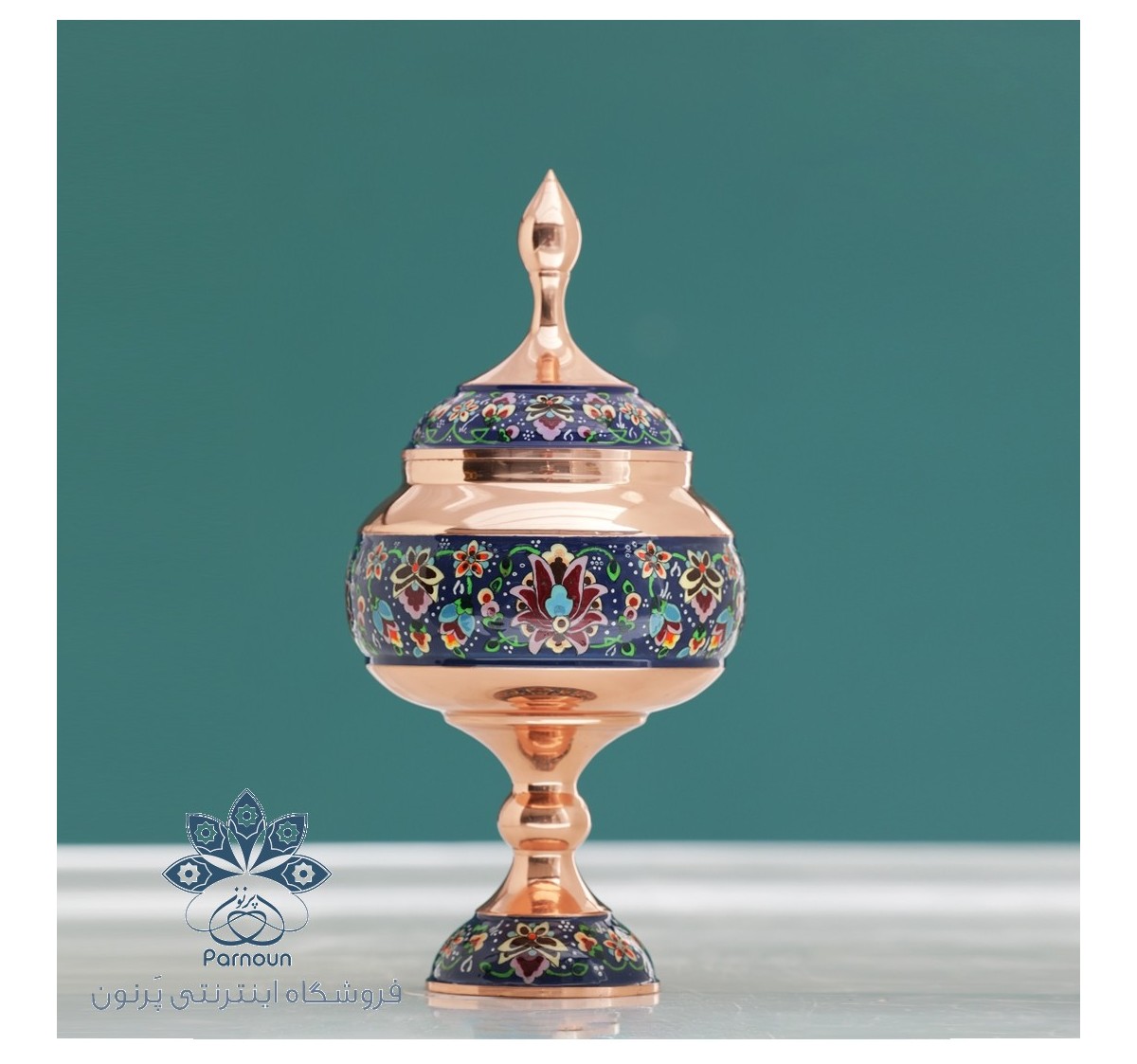 شیرینی خوری پایه دار مسی میناکاری با طرح گل های ختایی