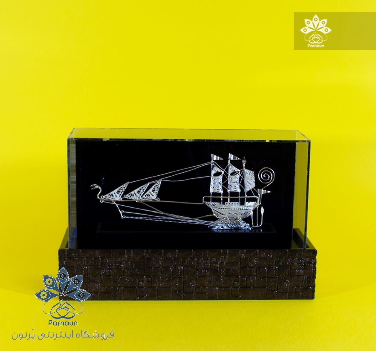 - تندیس زیبای شیشهای شفاف پلکسی با پشت صفحه سیاه رنگ برای جلوه نمایی بیشتر کشتی نقره.