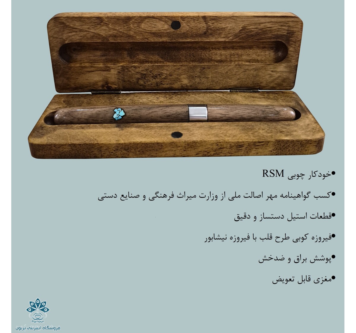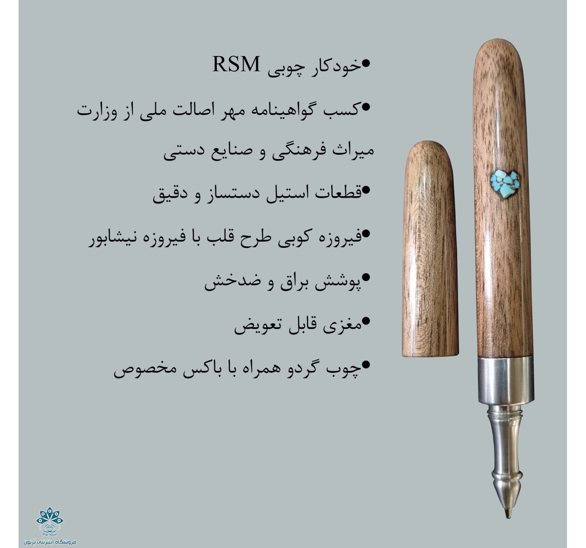 خودکار چوبی RSM مدل قلب فیرزوه کوبی شده موفق به کسب گواهینامه مهر اصالت ملی از وزارت میراث فرهنگی،گردشگری و صنایع دستی در سال 1403 شده است. در ساخت این مدل از چوب گردو استفاده شده وکلیه قطعات استیل دستساز و با دقت بالا ساخته شده است.