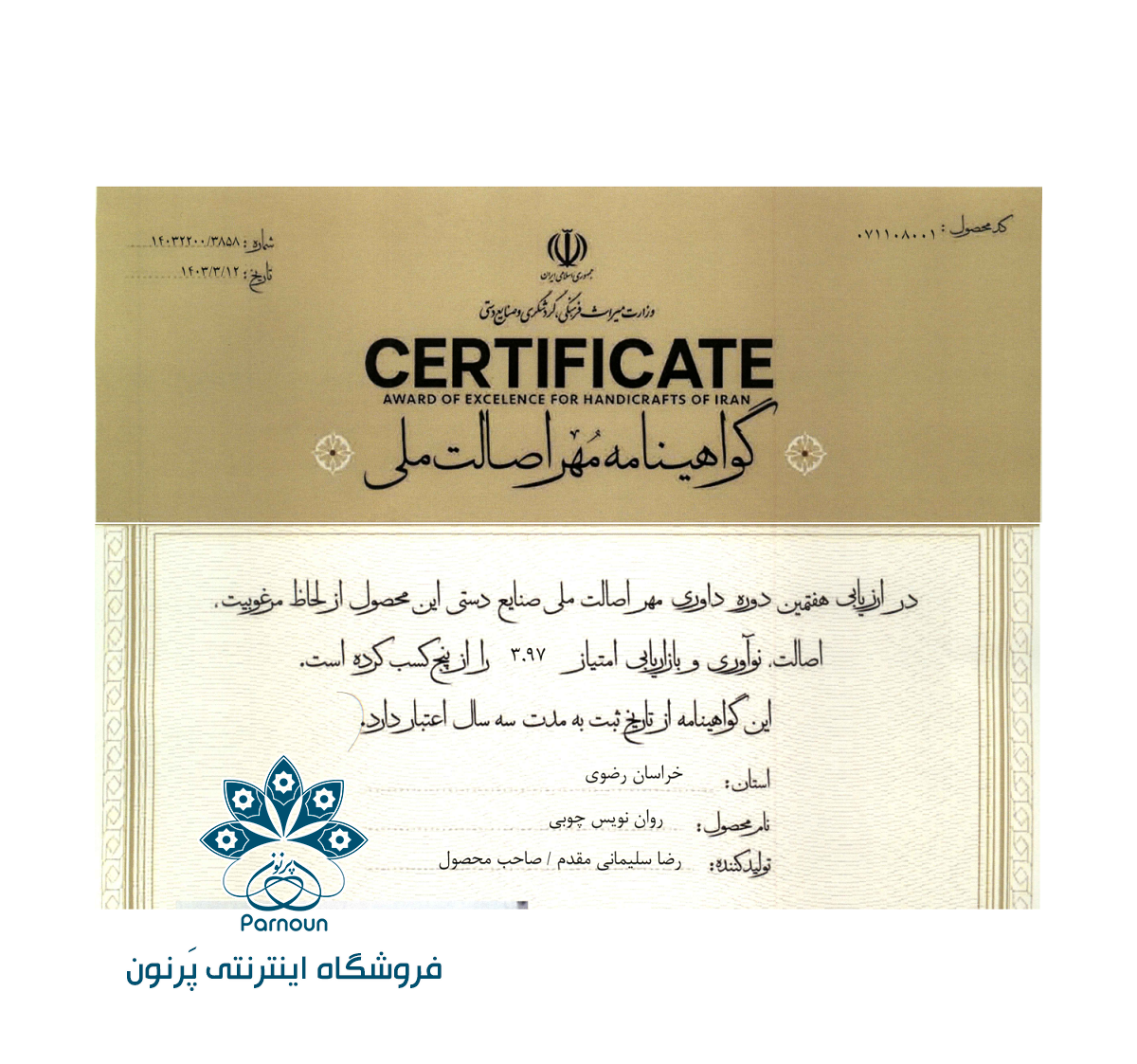 دارای گواهینامه مهراصالت ملی از وزارت میراث فرهنگی،گردشگری و صنایع دستی